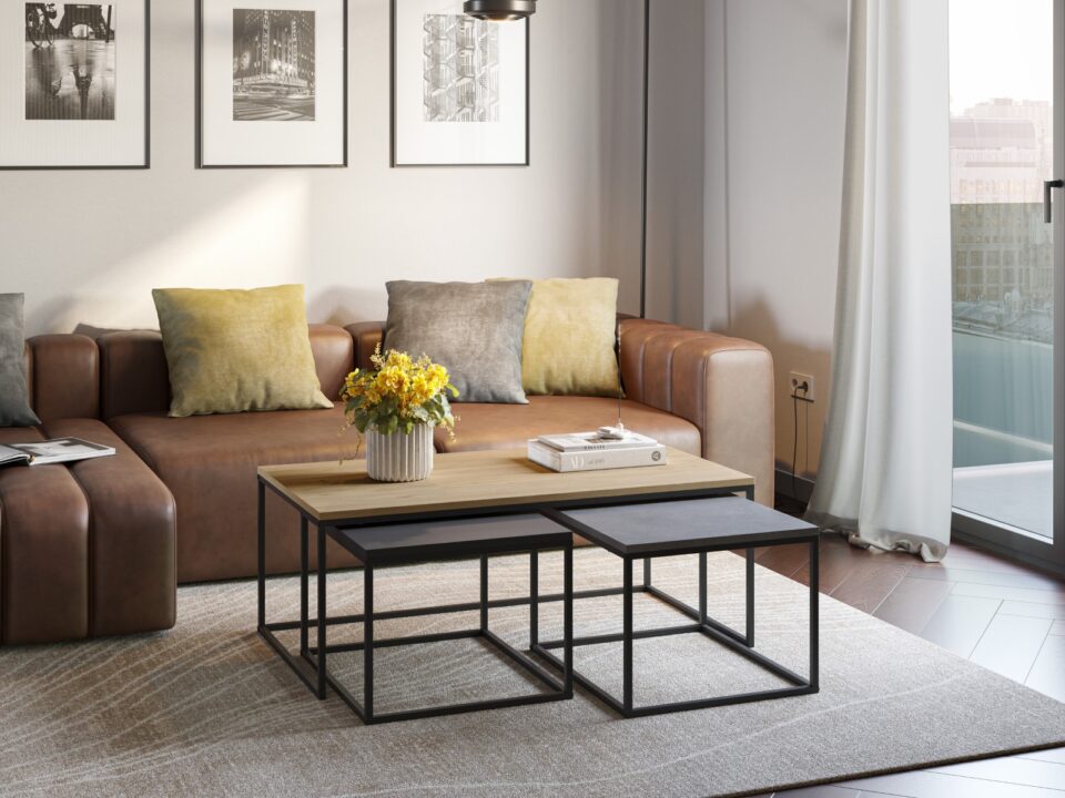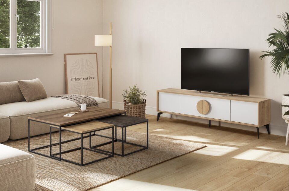 Namig za opremo: Komplet Camelia je odlična izbira za minimalistične in industrijske dnevne prostore. Zaradi nevtralne barvne kombinacije se enostavno ujema z različnimi zofami in TV omaricami.