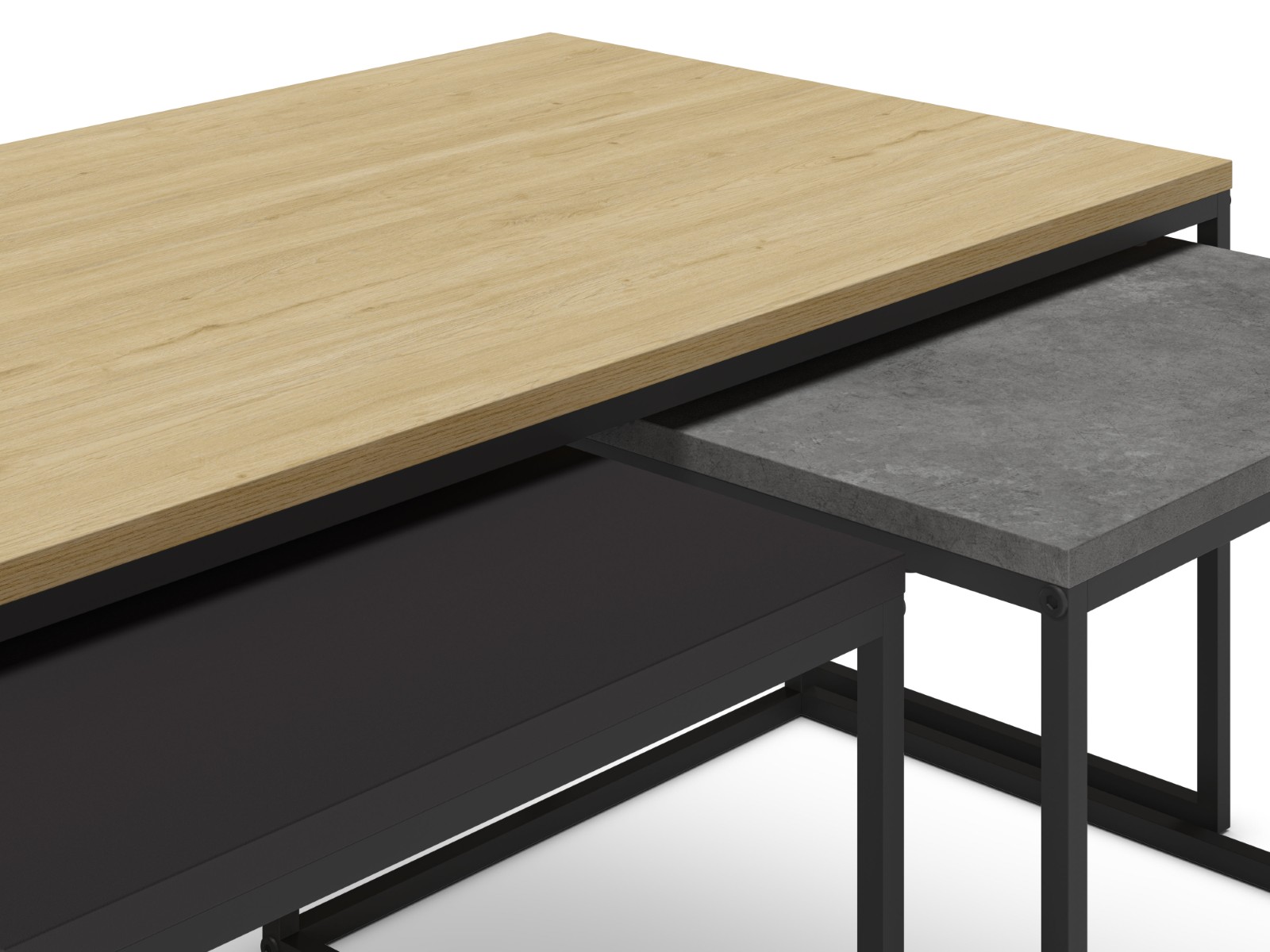 Komplet treh klubskih mizic Camelia v kombinaciji naravne in sive barve je praktična in estetsko dovršena rešitev za sodobne dnevne sobe. Z različnimi višinami in možnostjo zlaganja ena pod drugo ponujajo prilagodljivost za vsak prostor.