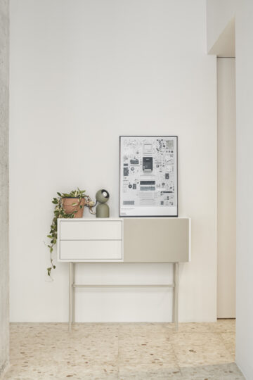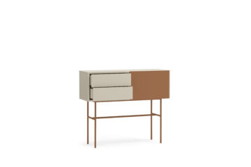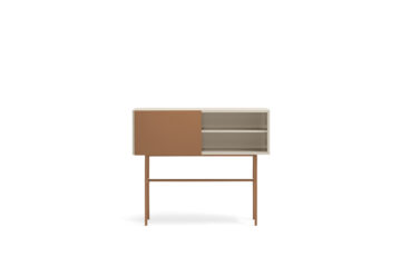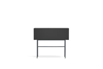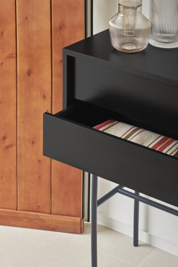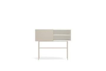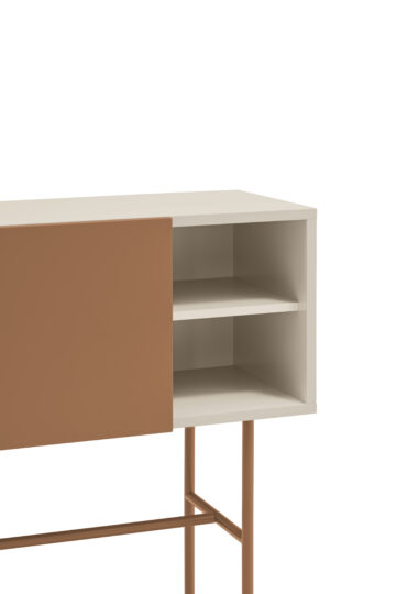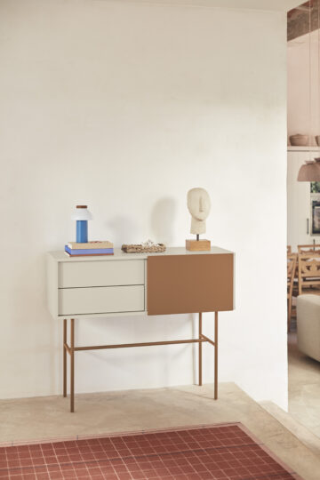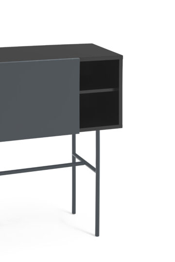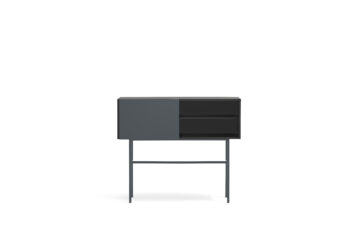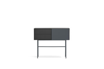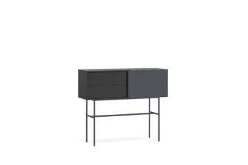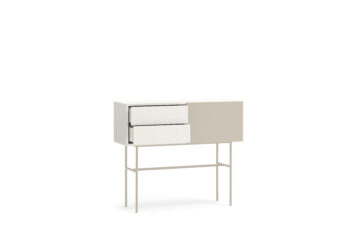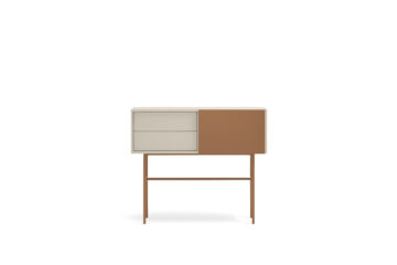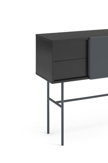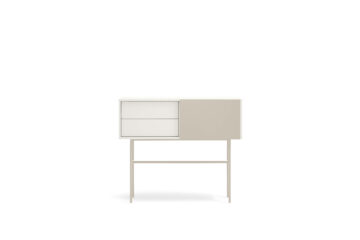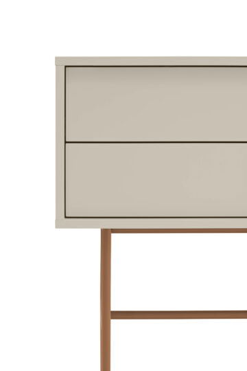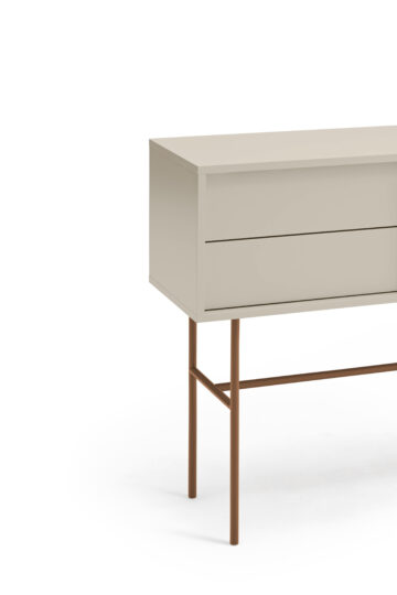 Brezčasna konzolna mizica Nube bo zasijala z minimalističnim dizajnom in prefinjenimi barvnimi kombinacijami. Sodobna toaletna mizica, ki je izdelana iz mediapana in opremljena z elegantnim sivim kovinskim podnožjem, nudi praktičen prostor za shranjevanje sestavljen iz 2 predalov in 2 polic, ki jih lahko prekrijete s premičnimi vrati. Preproste in čiste linije konzolne mizice so poudarjene z dizajnom brez ročajev. Kljub temu se lahko zanesete na praktični sistem Push to open, ki zagotavlja enostavno odpiranje predalov brez potrebe po ročajih. Komodo ponujamo v treh barvnih izvedbah: