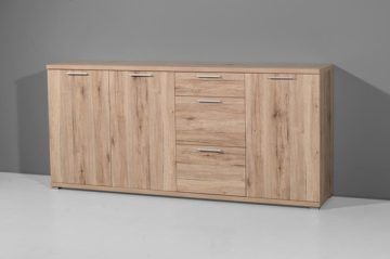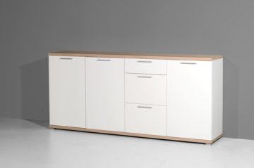 Sestavljena je iz oplemenitene iverne plošče E1 kvalitete, ki je zaščitena s folijo v beli barvi ali v sanremo hrast odtenku s “touchwood” površino. Komoda vključuje troje vrat in tri predale na sistem mehkega zapiranja. Robovi so ABS. Ročaji so kovinski. Dimenzije so: 192 x 88 x 40 cm. Top je delo priznanega nemškega proizvajalca pohištva Germania. Rok dobave je 3 – 45 dni.