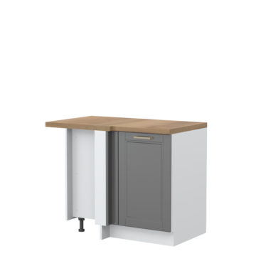 Program kuhinj Tara združuje moderni in rustikalni stil. Spodnja kuhinjska kotna omarica širine 109 cm z vrati, ki so profilirane, ter izvlečnimi žičnimi košarami – DESNA POSTAVITEV. Izbirate lahko med dvemi barvami front; grafit sivi in beli barvi. Barva korpusa je bela. Predali imajo tiho zapiranje in vodila Hettich. Fronte iz MDF so lakirane z najnovejšo tehnologijo UV mat lakiranja na vodni osnovi s katero dosežejo visoko stopnjo sijaja- 99,70%. Ta tehnologija lakiranja omogoča štirikrat boljšo odpornost proti fizičnim udarcem in obrabo, kot standardni lak. Delovno ploščo debeline 4cm lahko izbirate med naslednjimi barvami: