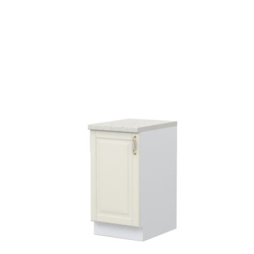 Kuhinjska spodnja omarica širine 45cm Evergreen s eno polico. Izdelana je iz oplemenitene plošče, debeline 18mm. Fronte pa so izelane iz MDF-ja in profilirane. Kuhinja združuje moderen in rustikalni stil. Delovna plošča debeline 4cm in podnožje s tesnilom vključena v ceno. Vrata imajo mehko zapiranje ter Hettich okovje. Ročaji ob doplačilu. Fronte so mat v barvi slonove kosti. Barva korpusa je bela. Delovno ploščo debeline 4cm lahko izbirate med naslednjimi barvami: