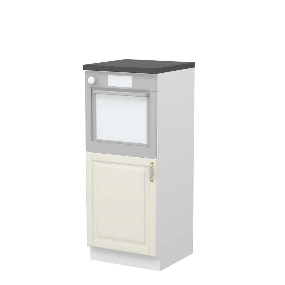Kuhinjska spodnja omarica Evergreen za vgradno pečico je izdelana iz kvalitetne oplemenitene plošče, debeline 18mm. Fronte, ki so iz MDF-ja in profilirane. Delovna plošča proizvajalca Egger in podnožje s tesnilom vključeno v ceni. Vrata imajo mehko zapiranje in Hettich okovje. Fronte so mat v barvi slonove kosti, barva korpusa pa je bela. Ročaji ob doplačilu. Delovno ploščo debeline 4cm lahko izbirate med naslednjimi barvami:
