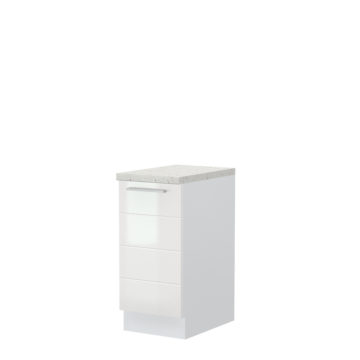 Barva korpusa je bela. Predali imajo tiho zapiranje in vodila Hettich. Fronte iz MDF so lakirane z najnovejšo tehnologijo UV lakiranja s katero dosežejo visoko stopnjo sijaja- 99,70%. Ta tehnologija lakiranja omogoča štirikrat boljšo odpornost proti fizičnim udarcem in obrabo, kot standardni lak. Delovno ploščo debeline 4cm lahko izbirate med naslednjimi barvami: