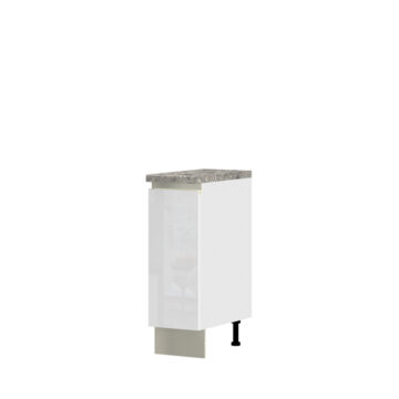 Barva korpusa je bela. Vrata imajo tiho zapiranje in vodila Hettich. Fronte iz MDF so lakirane z najnovejšo tehnologijo UV lakiranja s katero dosežejo visoko stopnjo sijaja- 99,70%. Ta tehnologija lakiranja omogoča štirikrat boljšo odpornost proti fizičnim udarcem in obrabo, kot standardni lak. Delovno ploščo debeline 4cm lahko izbirate med naslednjimi barvami: