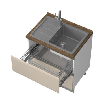 Linija kuhinj Invictus je skupek sodobnega dizajna, tehnologije in kvalitete. Zaradi njene rahlo zaobljene frontalne oblike in elegantnih eloksiranih aluminijskih ročajev jo uvrščamo med sodobno oblikovane kuhinje. Fronte so izdelane iz mediapana in mat lakirane z UV tehnologijo nanašanja mat laka, ki zagotavlja večjo odpornost in daljšo življensko dobo. Vsa vrata in predali imajo vgrajen mehanizem tihega zapiranja. Kuhinjska spodnja omarica Invictus za vgradnjo pomivalnega korita s predali in kovinskimi stranicami predalov je izdelana iz kvalitetne oplemenitene plošče, debeline 18mm. Vrata omarice pa so izdelana iz mediapana. Barva front omarice je Kašmir mat. Delovna plošča proizvajalca Egger in podnožje s tesnilom vključeno v ceni. Barva korpusa je bela. Predali imajo tiho zapiranje in vodila Hettich. Fronte iz MDF so lakirane z najnovejšo tehnologijo UV mat lakiranja s katero dosežejo visoko stopnjo sijaja- 99,70%. Ta tehnologija lakiranja omogoča štirikrat boljšo odpornost proti fizičnim udarcem in obrabo, kot standardni lak. Delovno ploščo debeline 4cm lahko izbirate med naslednjimi barvami