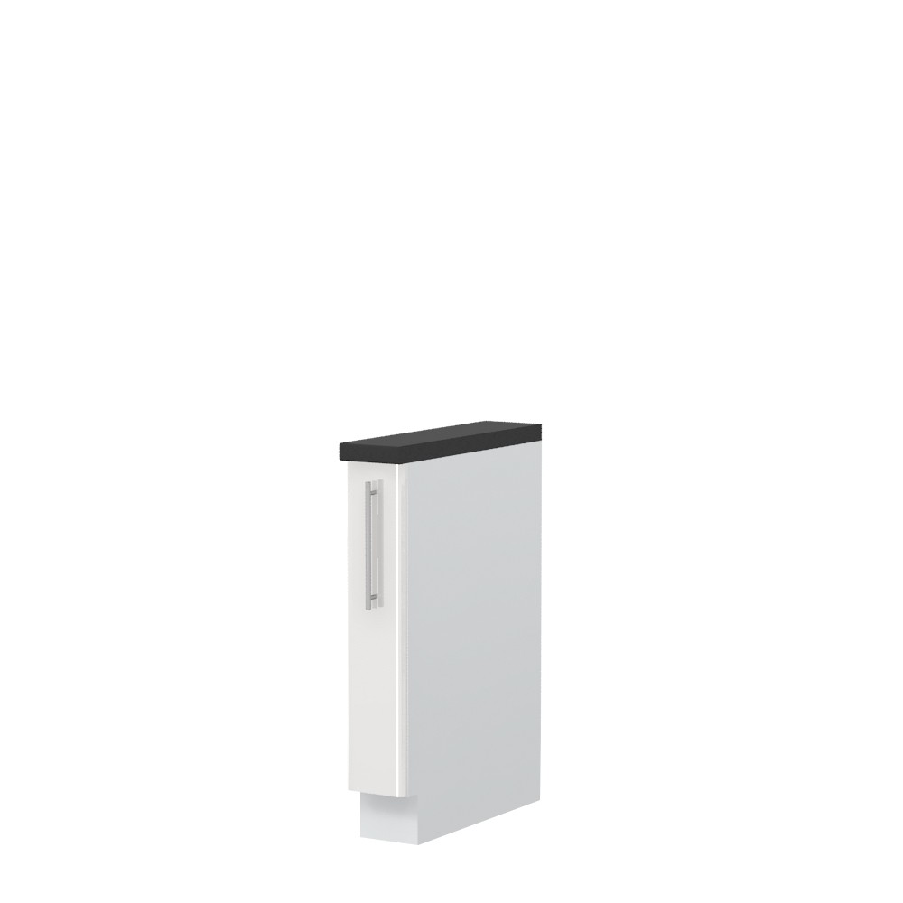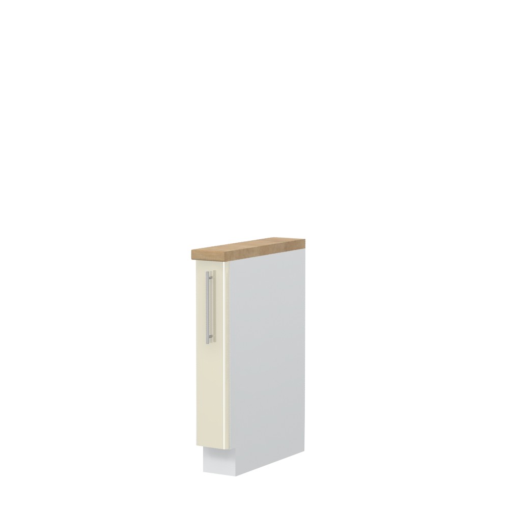 Kuhinjski element širine 15cm ima dve izvlečne poličke. Fronte iz MDF so lakirane z najnovejšo tehnologijo UV lakiranja s katero dosežejo visoko stopnjo sijaja- 99,70%. Ta tehnologija lakiranja omogoča štirikrat boljšo odpornost proti fizičnim udarcem in obrabo, kot standardni lak. Delovno ploščo debeline 4cm lahko izbirate med naslednjimi barvami: