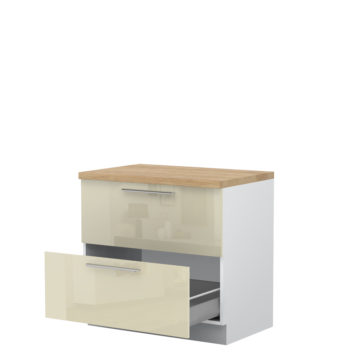 Kuhinjski element širine 80cm ima dva metal box predala ter mehko zapiranje. Fronte so lakirane z najnovejšo tehnologijo UV lakiranja s katero dosežejo visoko stopnjo sijaja- 99,70%. Ta tehnologija lakiranja omogoča štirikrat boljšo odpornost proti fizičnim udarcem in obrabo, kot standardni lak. Delovno ploščo debeline 4cm lahko izbirate med naslednjimi barvami: