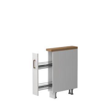 Program kuhinj Tara združuje moderni in rustikalni stil. Kuhinjska spodnja izvlečna omarica širine 15 cm. Fronte lahko izbirate v grafit sivi ali beli barvi. Barva korpusa je bela. Predali imajo tiho zapiranje in vodila Hettich. Fronte iz MDF so lakirane z najnovejšo tehnologijo UV mat lakiranja na vodni osnovi s katero dosežejo visoko stopnjo sijaja- 99,70%. Ta tehnologija lakiranja omogoča štirikrat boljšo odpornost proti fizičnim udarcem in obrabo, kot standardni lak. Delovno ploščo debeline 4cm lahko izbirate med naslednjimi barvami: