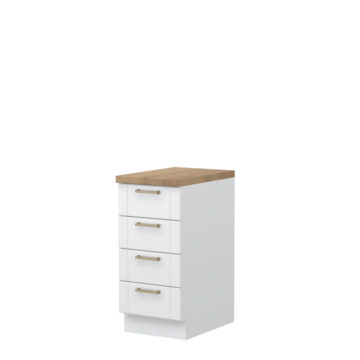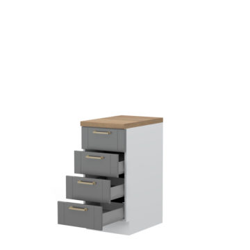 Program kuhinj Tara združuje moderni in rustikalni stil. Spodnja kuhinjska omarica širine 40 cm s štirimi kovinskimi stranicami predalov in nosilnostjo enega predala 30 kg. Izbirate lahko med dvemi barvami front; grafit sivi in beli barvi. Barva korpusa je bela. Predali imajo tiho zapiranje in vodila Hettich. Fronte iz MDF so lakirane z najnovejšo tehnologijo UV mat lakiranja na vodni osnovi s katero dosežejo visoko stopnjo sijaja- 99,70%. Ta tehnologija lakiranja omogoča štirikrat boljšo odpornost proti fizičnim udarcem in obrabo, kot standardni lak. Delovno ploščo debeline 4cm lahko izbirate med naslednjimi barvami: