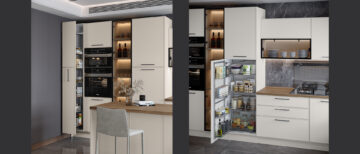 Visoki kuhinjski element širine 30 cm iz kolekcije kuhinj Opera ponuja elegantno rešitev za shranjevanje s praktičnim kromiranim žičnim mehanizmom in šestimi košarami. Prefinjena fronta v kašmir mat barvi, mehko zapiranje in možnost izbire dekorja korpusa zagotavljajo prilagodljivost in vrhunski videz v vsakem prostoru.