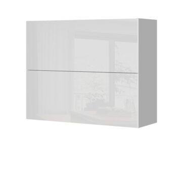 Kuhinjska zgornja viseča omarica Infinity. Korpus je narejena iz oplemenitene plošče debeline 18 mm v beli barvi, fronte pa so izdelane iz MDF-mediapana ter lakirane z UV tehnologijo nanašanja laka s katero dosežejo visoko stopnjo sijaja- 99,70% Ta tehnologija omogoča štirikrat boljšo odpornost proti fizičnim udarcem in obrabo, kot standardno lakiranje. Vsa vrata imajo vgrajen mehanizem mehkega zapiranja in dvižna vrata.