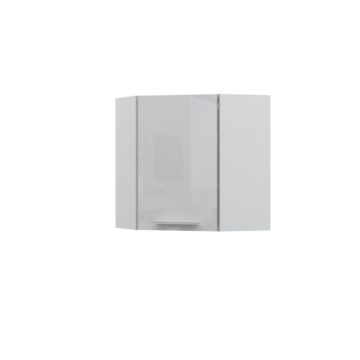 Kuhinjska zgornja kotna omarica Riva je narejena iz oplemenitene plošče debeline 18 mm, barva korpusa je bela. Omarica ima ena vrata in dve polici. Vsa vrata imajo vgrajen mehanizem mehkega zapiranja. Fronte lahko izbirate v dveh barvah: