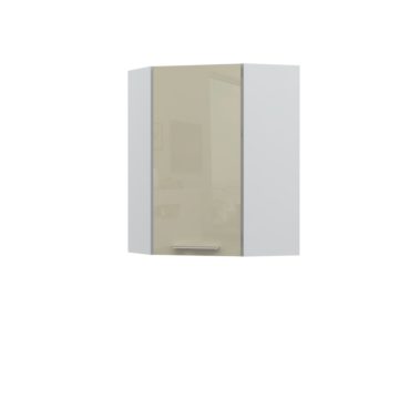 Kuhinjska zgornja kotna omarica Riva je narejena iz oplemenitene plošče debeline 18 mm, barva korpusa je bela. Omarica ima ena vrata in dve polici. Vsa vrata imajo vgrajen mehanizem mehkega zapiranja. Fronte so izdelane iz MDF-mediapana in UV lakirane.