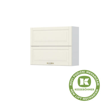 Kuhinjska zgornja omarica širine 90 cm Evergreen, dvižna vrata. Izdelana je iz oplemenitene plošče, debeline 18mm. Fronte pa so izdelane iz MDF-ja in profilirane. Kuhinja združuje moderen in rustikalni stil.