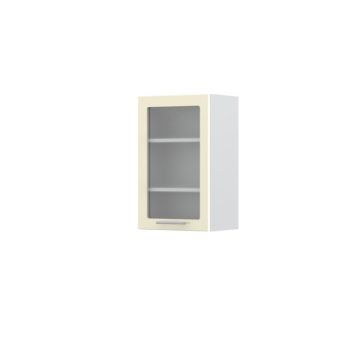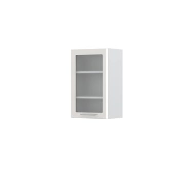 Kuhinjska zgornja omarica širine 40 cm Modern z enim vratnim krilom ter zaobljenimi robovi in kaljenim steklom debeline 4mm. Okvir je izdelan iz mediapana in UV lakiran. Vrata imajo mehanizem mehkega zapiranja. Omarica ima dve polici. Ročaji za doplačilo. Fronte lahko izbirate v več barvah: