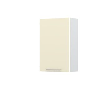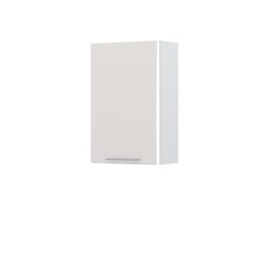 Kuhinjska zgornja viseča omarica Modern je narejena iz oplemenitene plošče debeline 18 mm, barva korpusa je bela. Omarica ima ena vrata in dve polici. Vsa vrata imajo vgrajen mehanizem mehkega zapiranja. Fronte iz MDF lakirane z najnovejšo tehnologijo UV lakiranja s katero dosežejo visoko stopnjo sijaja- 99,70%. Ta tehnologija omogoča štirikrat boljšo odpornost proti fizičnim udarcem in obrabo, kot standardno lakiranje. Fronte lahko izbirate v več barvah: