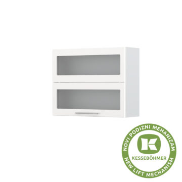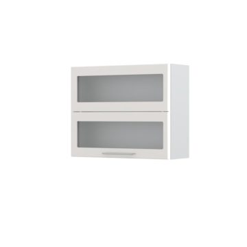 Kuhinjska zgornja viseča omarica s steklom Modern z dvema kriloma, zaobljenimi robovi in kaljenim steklom debeline 4mm. Fronto lahko izbirate v več barvah. Obod je narejena iz oplemenitene plošče debeline 18 mm, bele barve. Omarica ima eno polico, ter mehanizem mehkega zapiranja. Omarica je široka 90 cm in visoka 72 cm. Barva korpusa: