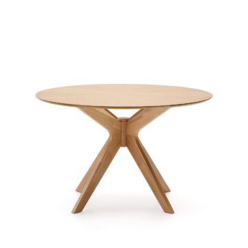 Jedilna miza Naanim s premerom 120 cm je prefinjen kos pohištva z edinstveno osebnostjo. Mizna plošča iz naravnega hrastovega furnirja se ponaša z unikatnim zvezdastim vzorcem lesnih vlaken, ki dodajo karakter in toplino. Masivne noge iz kavčukovca poskrbijo za stabilnost in estetski kontrast.