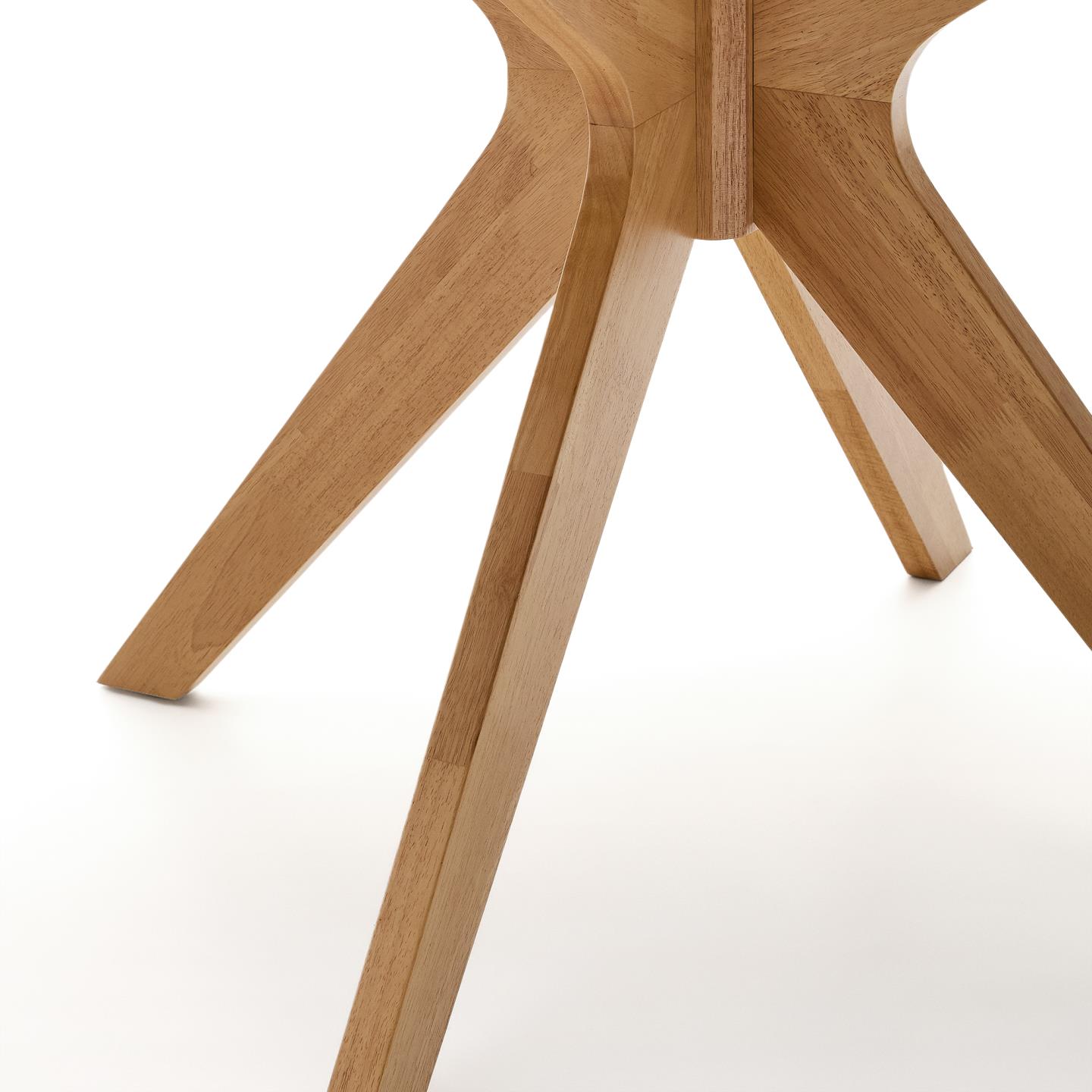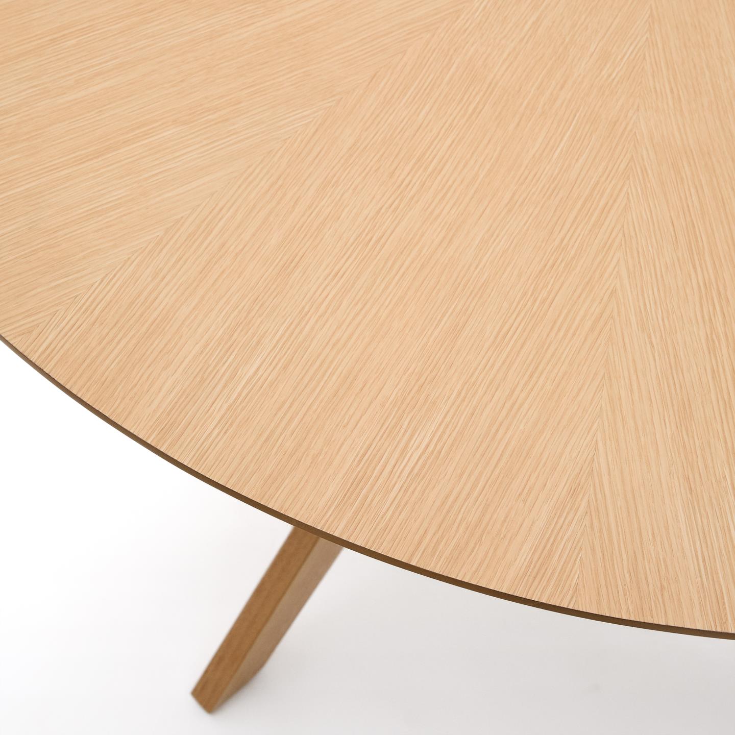 Jedilna miza Naanim s premerom 120 cm je prefinjen kos pohištva z edinstveno osebnostjo. Mizna plošča iz naravnega hrastovega furnirja se ponaša z unikatnim zvezdastim vzorcem lesnih vlaken, ki dodajo karakter in toplino. Masivne noge iz kavčukovca poskrbijo za stabilnost in estetski kontrast.