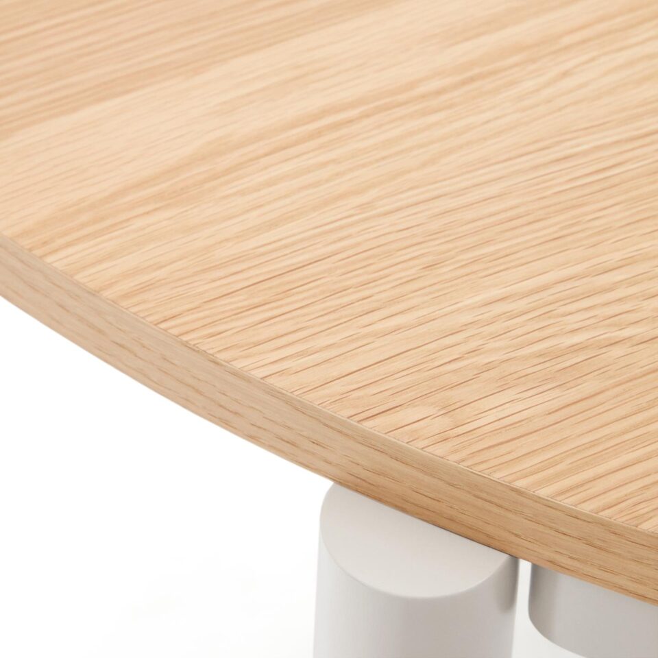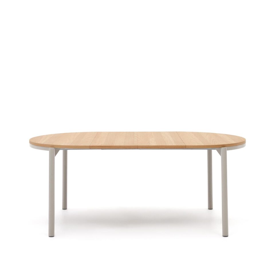 Raztegljiva okrogla miza Montuiri omogoča prilagodljivo uporabo jedilnega prostora, saj jo lahko enostavno podaljšate glede na število gostov ali priložnost. Furnir hrasta v naravnem odtenku in kovinske noge v sivi barvi ustvarjajo uravnotežen videz, ki se lepo poda tako v sodobne kot bolj klasične interierje, tudi v manjše prostore.