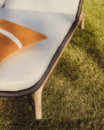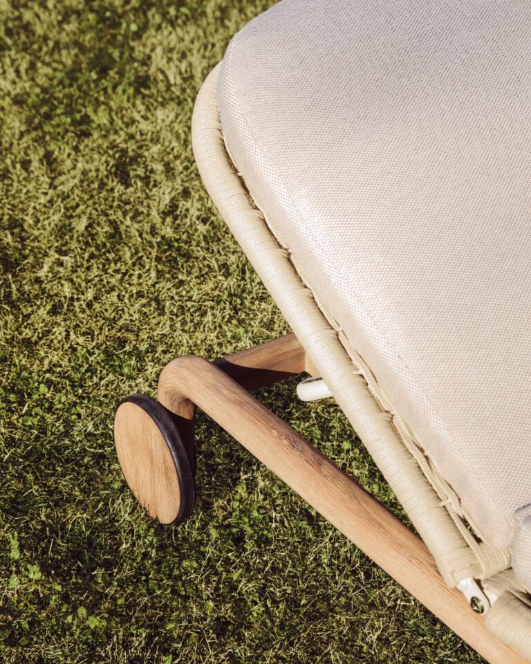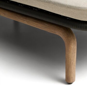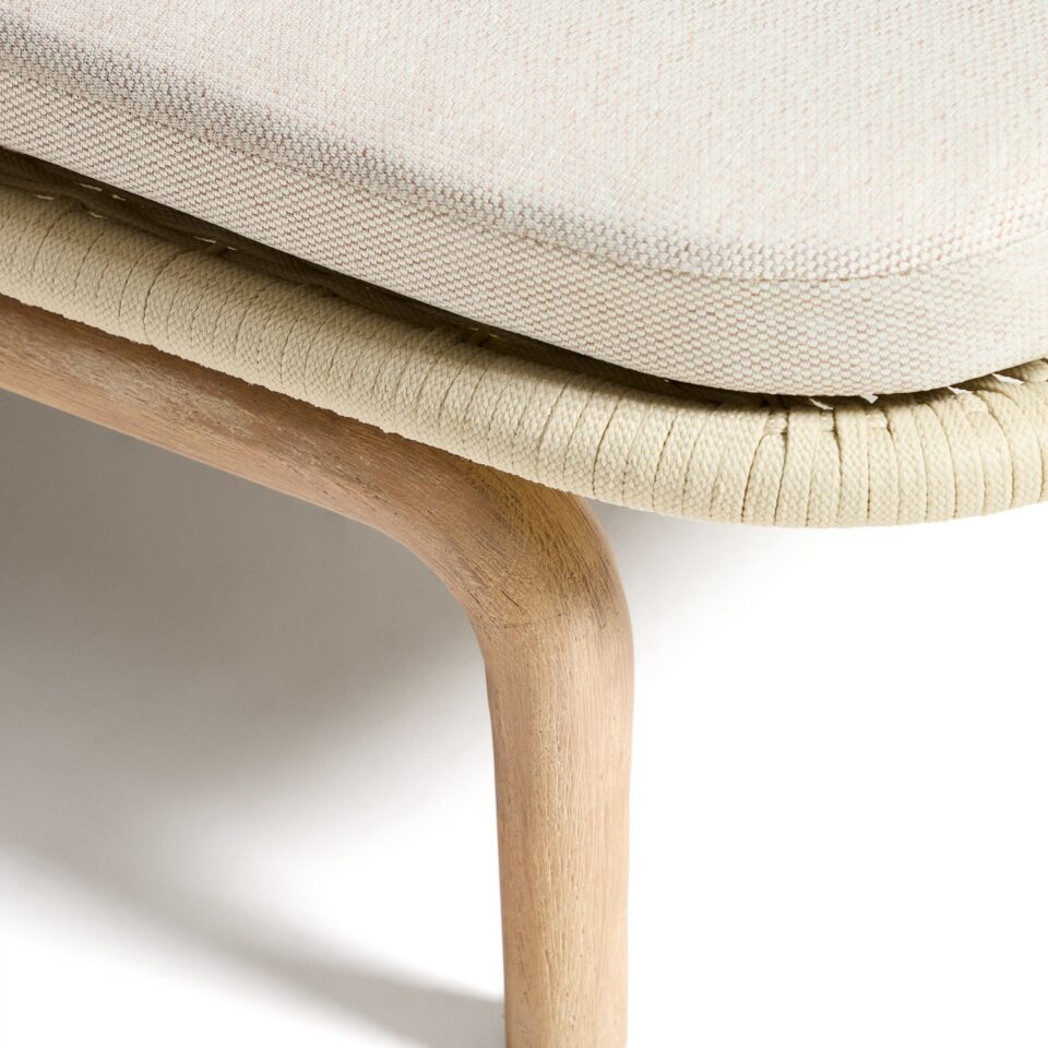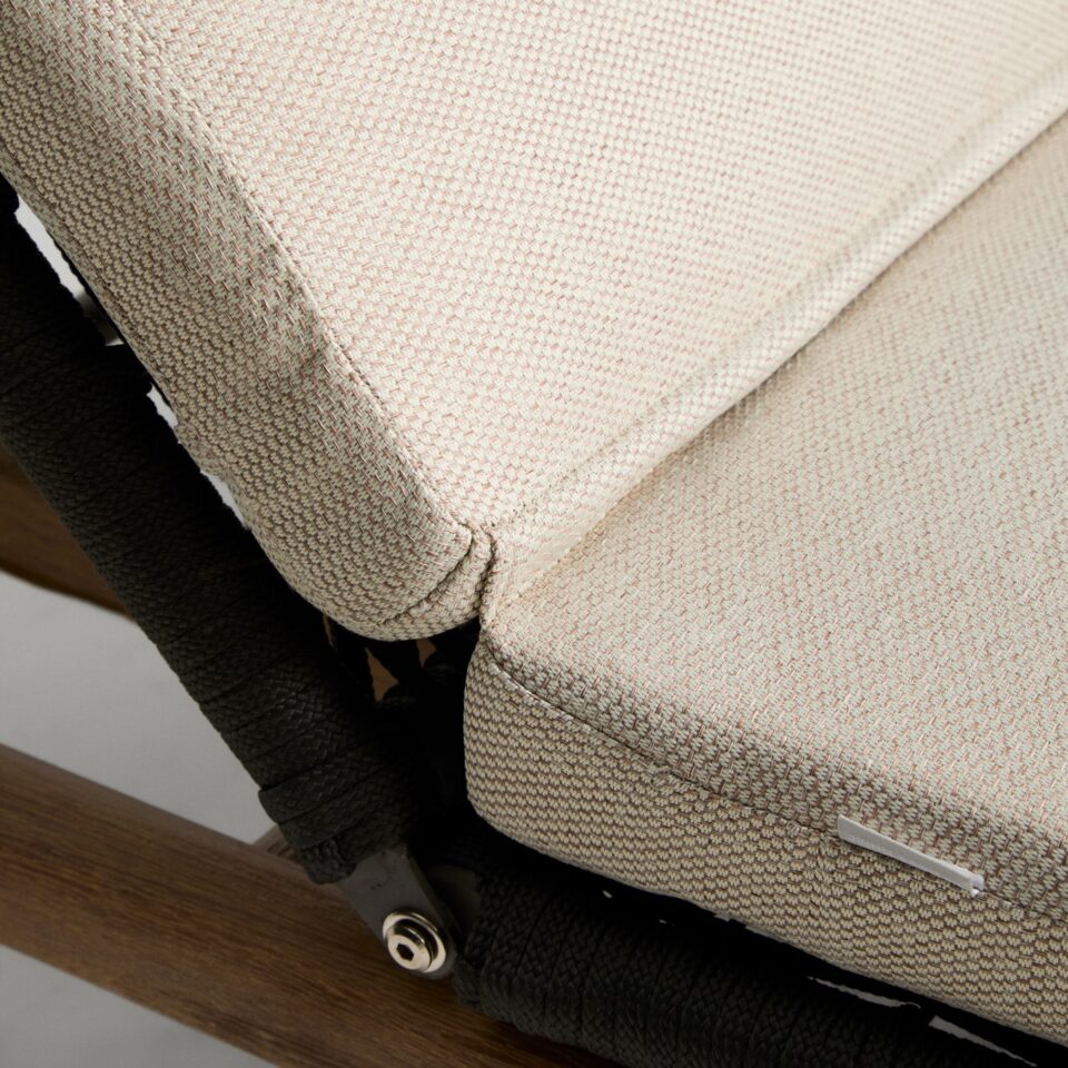 - Ročno tkana površina: Sedežni del je ročno tkan iz vrvi, odporne na UV žarke, kar zagotavlja optimalno udobje in ohranja svoj videz skozi čas.