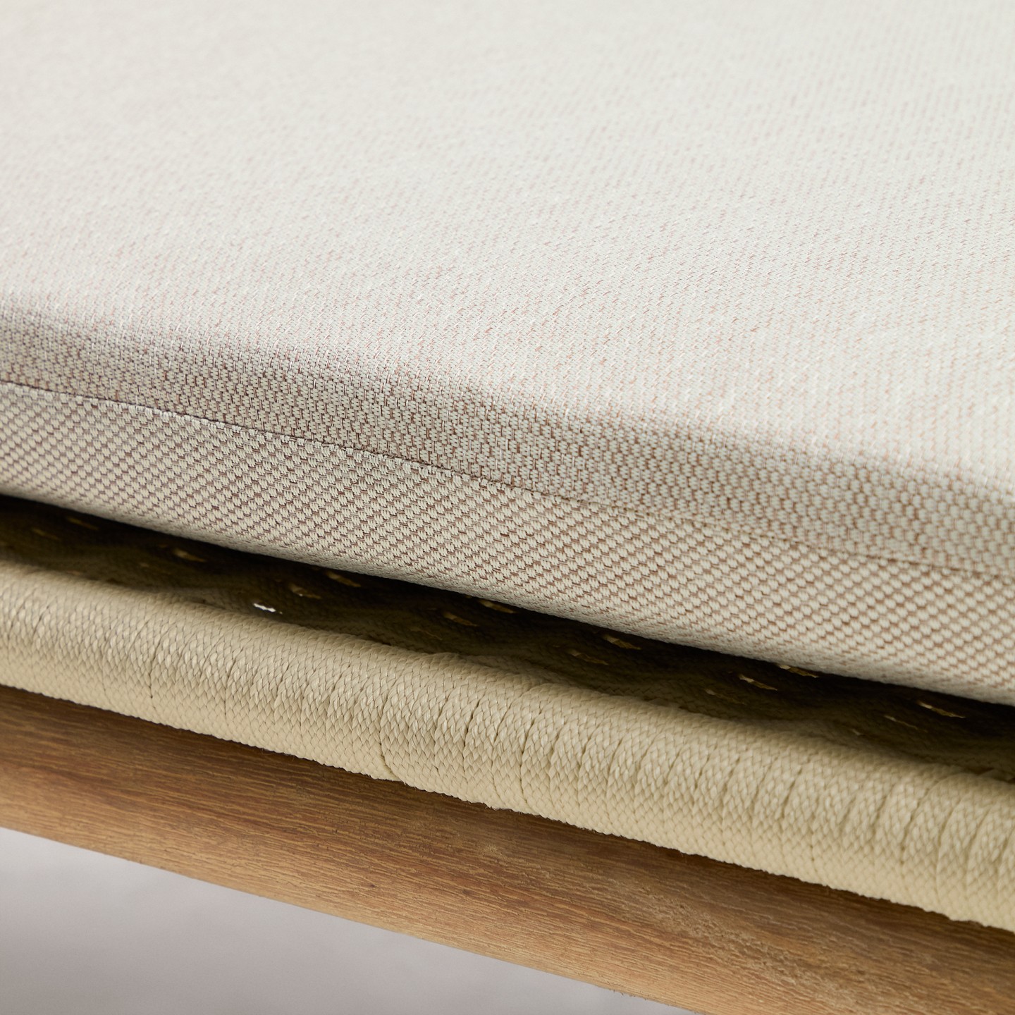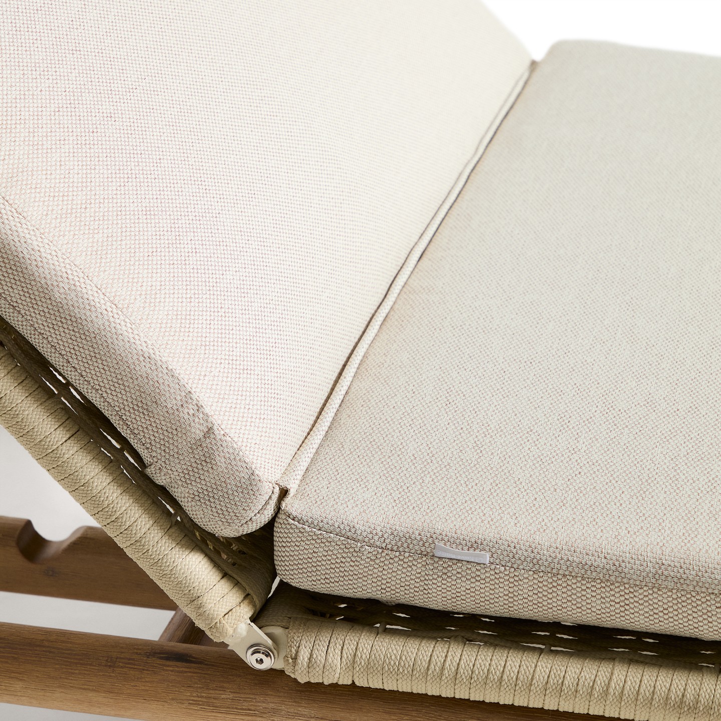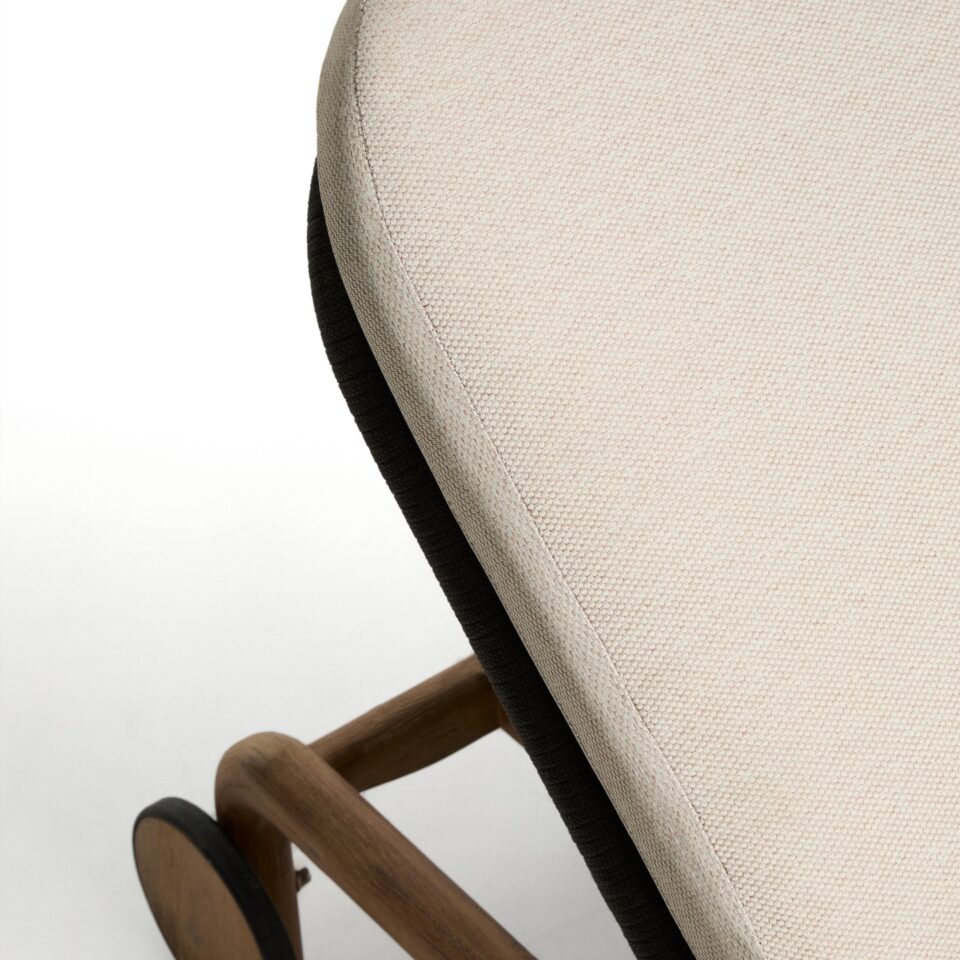 - Ročno tkana površina: Sedežni del je ročno tkan iz vrvi, odporne na UV žarke, kar zagotavlja optimalno udobje in ohranja svoj videz skozi čas.