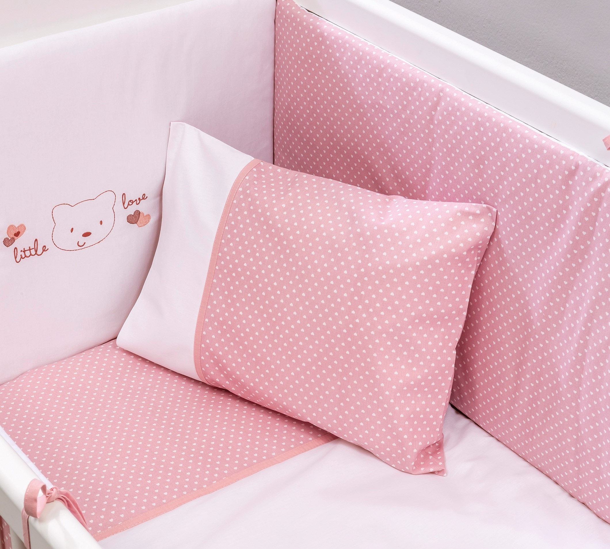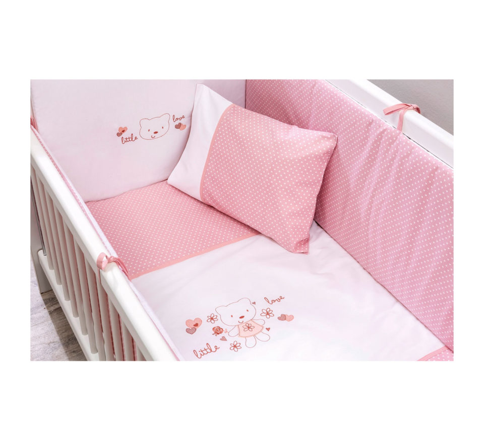 Posteljnina Little Love Baby je narejena iz najboljšega bombaža in je sestavljena iz prevleke za vzmetnico, zaščitne ograje, pregrinjala in prevleke za vzglavnik. Nežni toni in okrasno vezenje ji dajejo poseben čar.
