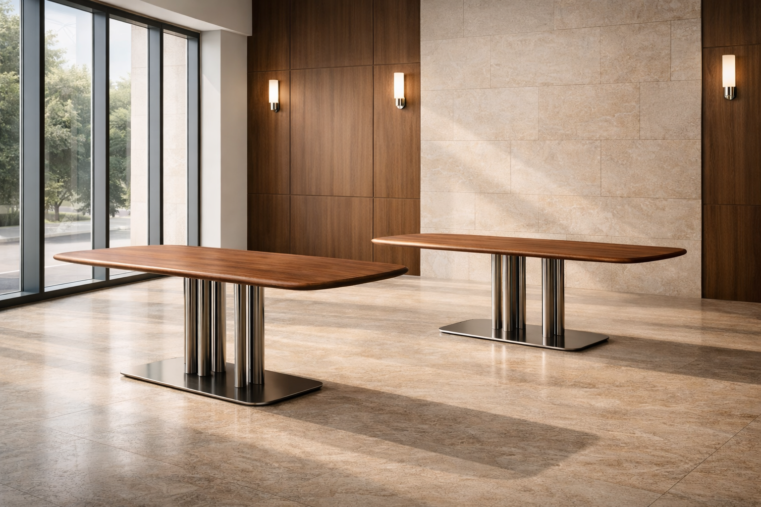 Značaj mize poudarjajo noge iz nerjavečega jekla različnih premerov z brušeno obdelavo, ki zmanjšuje vidnost prstnih odtisov. Kontrast materialov in volumnov ustvari markantno silhueto, ki jedilnico preoblikuje v sodoben prostor z brezčasnim značajem. Stabilnost na vseh podlagah zagotavljajo nastavljivi drsniki na spodnjem delu podnožja.
