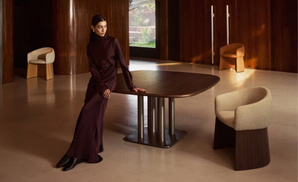 Melvar na novo interpretira slog sredine prejšnjega stoletja s poudarkom na sodobni eleganci in trajni vrednosti. Temen oreh se povezuje z diskretno močjo nerjavečega jekla ter ustvarja uravnotežen videz, ki izstopa po svojem značaju. Skulpturalne linije in natančno dodelani detajli prostoru dodajo izrazit, a hkrati umirjen poudarek.