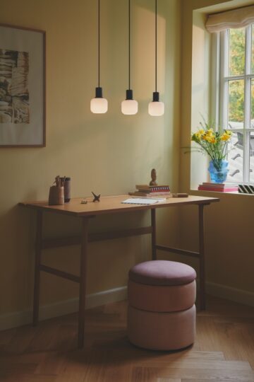 Milford Mini je dekorativna serija z ročno pihanimi opalnimi stekli, ki ustvarja mehak in skoraj “nabrano” podobo. Moderni in preprosti dizajn, ki združuje opalno steklo in črn metal, prinaša eleganco ter nežno osvetljuje prostor.