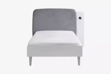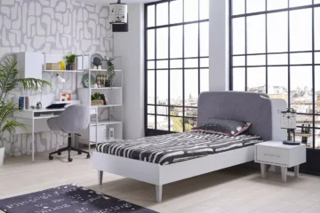 Mladinska postelja Simply White združuje eleganten videz in inovativne funkcionalnosti, ki zagotavljajo maksimalno udobje in priročnost. Oblazinjeno vzglavje v sivi barvi ponuja dodatno udobje, medtem ko integriran lesen trak z dvema USB priključkoma omogoča enostavno polnjenje pametnih telefonov ali tablic neposredno ob postelji. Trak lahko namestite na levo ali desno stran, glede na vaše potrebe.