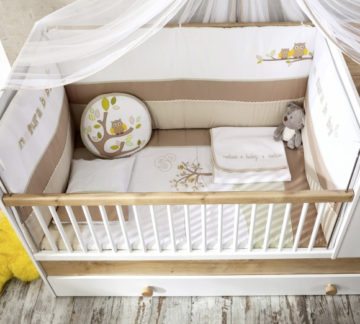 Posteljnina Natura Baby je narejena iz najboljšega bombaža in je sestavljena iz prevleke za vzmetnico, zaščitne ograje, pregrinjala, odeje, okrasne blazine in prevleke za vzglavnik. Nežni toni in okrasno vezenje z motivom sove ji dajejo poseben čar.