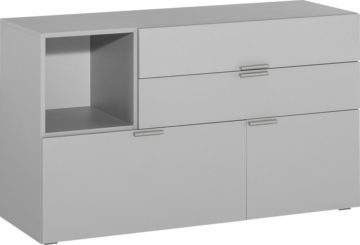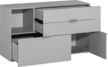 Komoda ima tri predale in ena vrata. Vrata in predali se mehko zapirajo. Izdelana je iz oplemenitene iverne plošče zaščitene z melaminom vrhunske kakovosti.