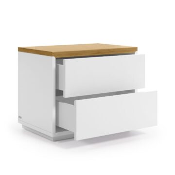 Sodobna nočna omarica Abilen se odlikuje z elegantnim videzom in ostrim dizajnom. Izdelana je iz lakirane MDF plošče hrastovega furnirja v naravnem odtenku. Ima dva predala.