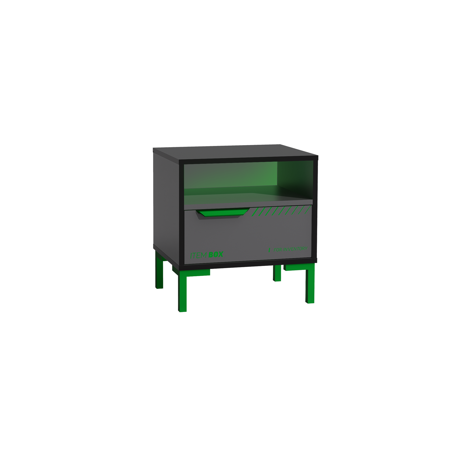 Nočna omarica Targon je sodoben kos pohištva za mladinsko sobo, ki pritegne pozornost s svojo stilsko in funkcionalno zasnovo. Opremljena z osvetlitvijo na zgornji polici, zagotavlja prijetno vzdušje, medtem ko funkcija brezžičnega polnjenja na zgornji plošči omogoča enostavno polnjenje vaših naprav. S kombinacijo črno-sivih barv in zelenih detajlov omarica popolnoma dopolnjuje sodoben stil dekoracije in je idealna za vse, ki iščejo estetsko in praktično rešitev za k postelji.