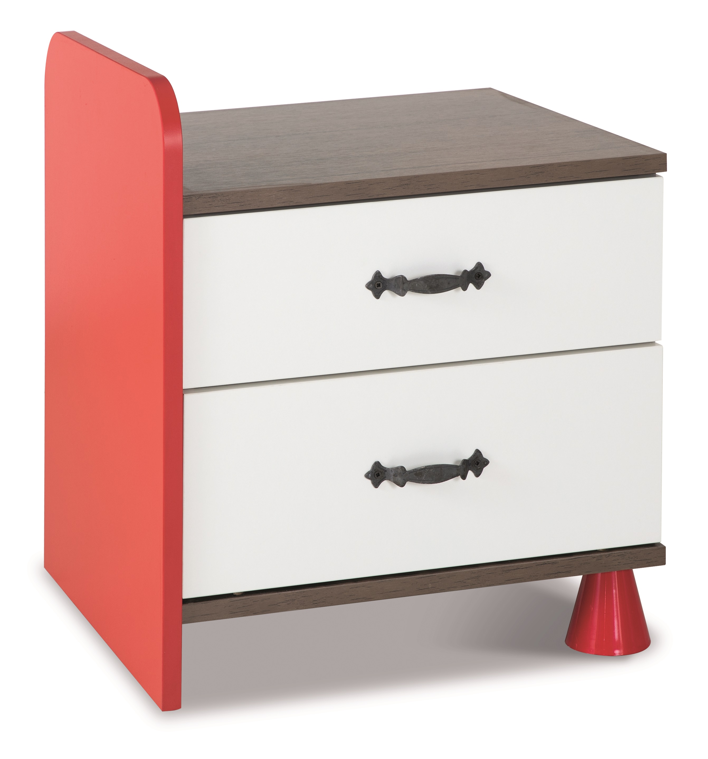 Nočna omarica v videzu lesa, kovine in rdeče barve za živahen videz otroške sobe. Ogrodje nočne omarice je izdelano iz oplemenitene iverne plošče E1 kakovosti, debeline 18mm. Vsi robovi so ABS zaobljeni. Predali imajo mehanizem mehkega zapiranja.