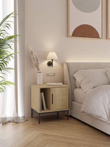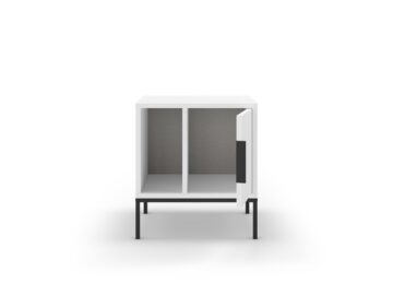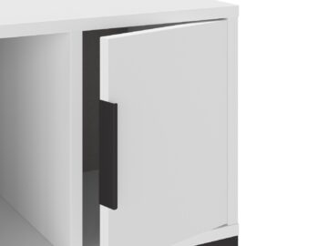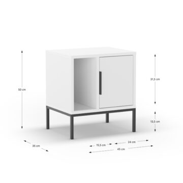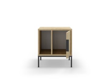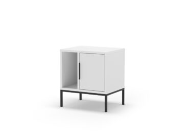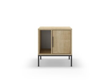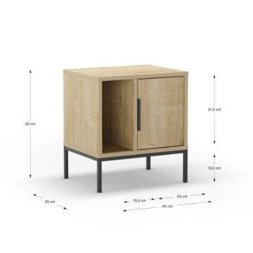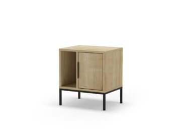 Sodobna omarica z jasno industrijsko noto: čistih linij, poudarjena s črnimi kovinskimi nogami in ročajem. Vrata skrivajo zaprti odlagalni prostor, odprta polica pa omogoča hiter dostop do knjig ali dekoracije.