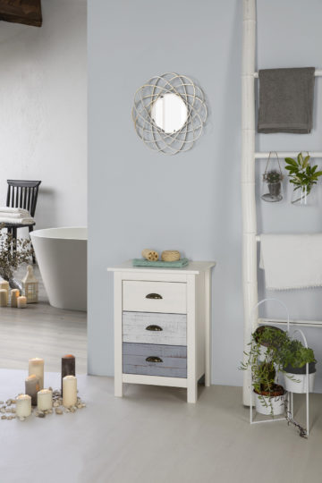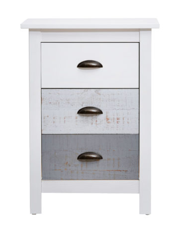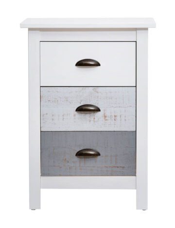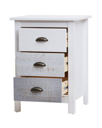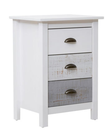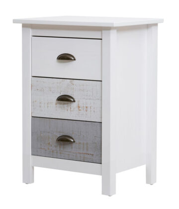 Nočna omarica Romantica s tremi predali, izdelana iz kakovostnega borovega lesa, meri 35 cm v širino, 46 cm v globino in 65 cm v višino. Ta nočna omarica združuje funkcionalnost in klasičen dizajn, zaradi česar je idealna za uporabo v različnih spalniških slogih.