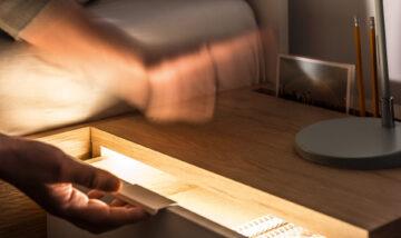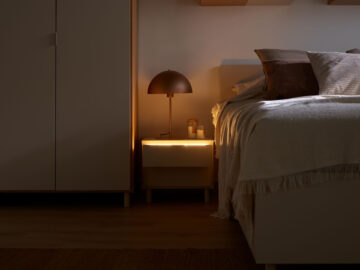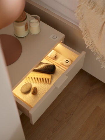 Nočna omarica Simple omogoča priročno organizacijo predmetov, ki jih potrebujete pred spanjem in po prebujanju. Vsebuje dva predala z mehkim zapiranjem, zgornji predal pa ima vgrajeno toplo osvetlitev, ki se aktivira z dotikom senzorja. S tem bo iskanje nujnih predmetov sredi noči hitro in enostavno, mehka svetloba pa vas ne bo zbudila.