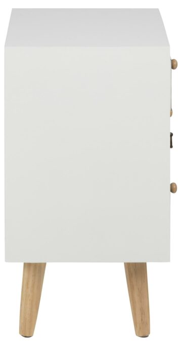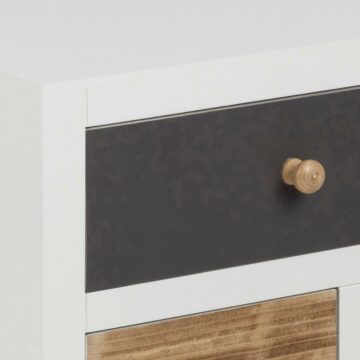 Nočna omarica Thais prinaša živahnost in naravni slog v vaš dom s svojimi barvnimi variacijami in elegantno zasnovo. Narejena iz bele NC lakirane MDF in s podnožjem iz lakiranega bora, ta komoda ponuja štiri predale iz večbarvnih materialov, kar ji daje edinstven in igriv videz. Zaradi svoje vitke zasnove je idealna za manjše prostore, kot so stanovanja ali študentske sobe.