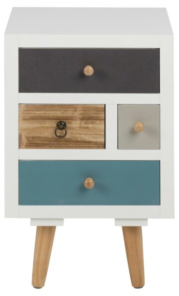 Nočna omarica Thais je odlična izbira za spalnice, otroške sobe, igro ali hodnike, kjer potrebujete dodaten prostor za shranjevanje. Štiri predale nudijo dovolj prostora za organizacijo vseh vaših potrebščin, medtem ko barvita zasnova dodaja energijo in karakter prostoru.