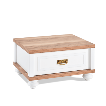 Nočna omarica Tina je sodobnega videza, ki se najočitneje izraža v elegantni obliki in modernem spoju lesa in bele barve. Predal deluje na mehanizem tihega zapiranja. Izdelana je iz iverne plošče, katere robovi so za podaljšano obstojnost in povečano odpornost zaščiteni z ABS robnim trakom.