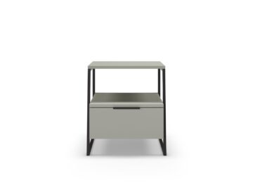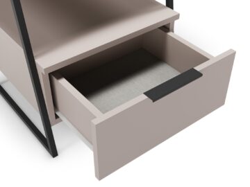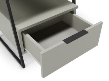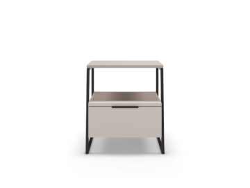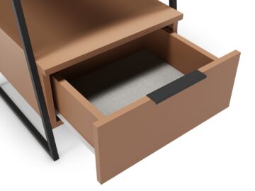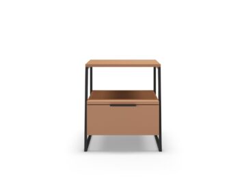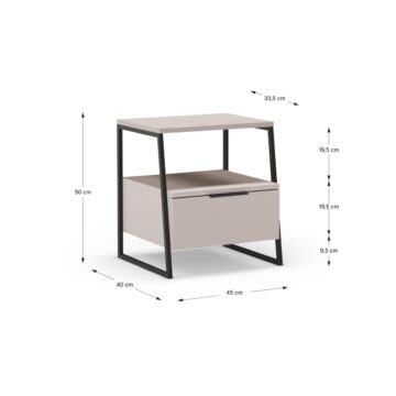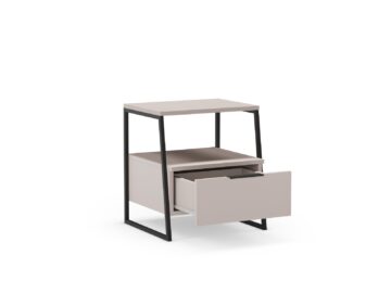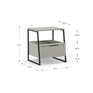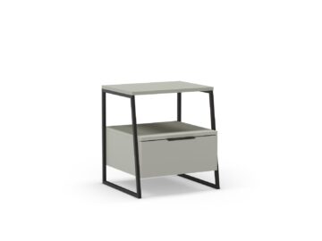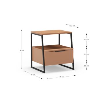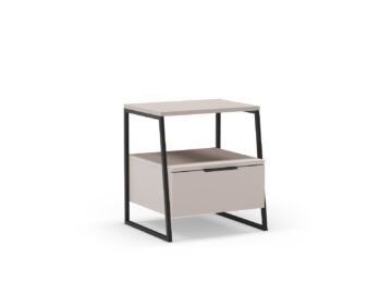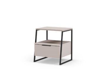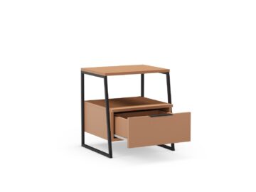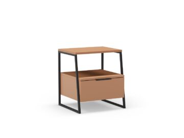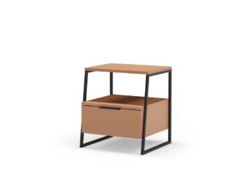 Nočna omarica Velia združuje sodoben industrijski videz in praktično zasnovo. Kovinsko ogrodje nudi stabilnost, prostoren predal in odprta polica pa omogočata odlično shranjevanje ob postelji ali kavču.