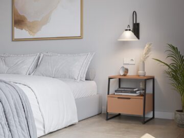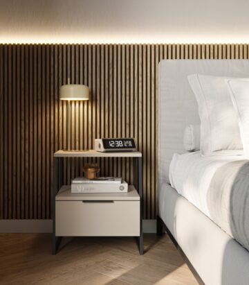 Nasvet za opremo: Popestrite nočno omarico z manjšo namizno svetilko in knjigo na odprti polici. Odlično se poda k kovinskim posteljnim okvirjem ali lesenim posteljam z mat zaključkom.