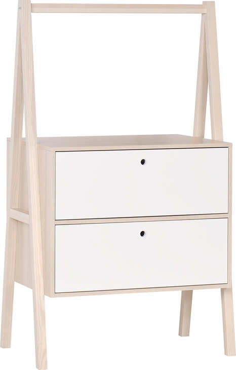 Nekonvencionalno nočno omarico odlikuje sodoben stil s pridihom nežnosti. Omarica ima iz lesa izdelano podnožje, ki je rahlo višje od običajnega. Dva predala sta kontrastične bele barve, preostalo ogrodje pa je dopolnjeno s furnirjem akacije. Podnožje se stika v drogu na vrhu omarice, kjer lahko z uporabo visečih shranjevalnikov še dodatno privarčujete na prostoru.