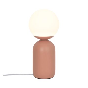 Namizna svetilka Notti v rjavi barvi prinaša organsko in harmonično obliko z lahkim nordijskim oblikovanjem. Njena preprostost in mehkoba sta ključni značilnosti – zaobljena, matirana osnova je čudovit kontrast do bele opalne steklenkaste kupole, ki zagotavlja vizualno prostornost in prijetno svetlobo.