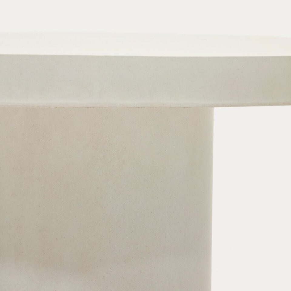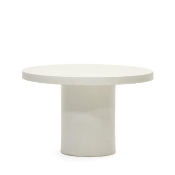 Okrogla miza Aiguablava iz belega cementa premera 120 cm združuje minimalistično obliko, čiste linije in izrazit značaj. Zaradi robustne konstrukcije iz cementa je odporna na vremenske vplive, zato je primerna tako za notranje prostore kot za terase, vrtove ali pokrite zunanje kotičke.