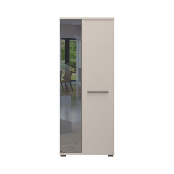 Garderobna omara Milla Opera V2OG združuje eleganco, funkcionalnost in vrhunsko izdelavo. S svojo subtilno barvo Kašmir, profiliranim okvirjem in velikim zunanjim ogledalom, postane osrednji kos vsakega prostora. Izvlečna garderobna palica, prostorni predali in visokokakovostni tečaji z mehkim zapiranjem zagotavljajo udobno in praktično uporabo. Uporabljeni materiali, kot so Univer Egger in UV mehak mat lak, ter prefinjeni mat ročaji v barvi Cortado rjava, dodajajo pridih prestiža in trajnosti.