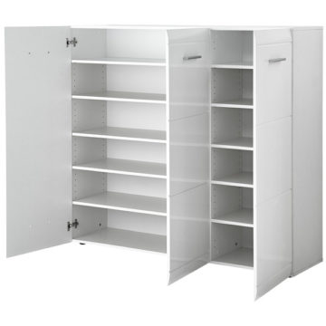 Omarica za čevlje Adana je dobavljiva beli barvi, s tremi vrati in prostornino za 36 parov čevljev. Vrata omarice so izdelane iz MDF-a (mediapana), lakirane na visoki sijaj.